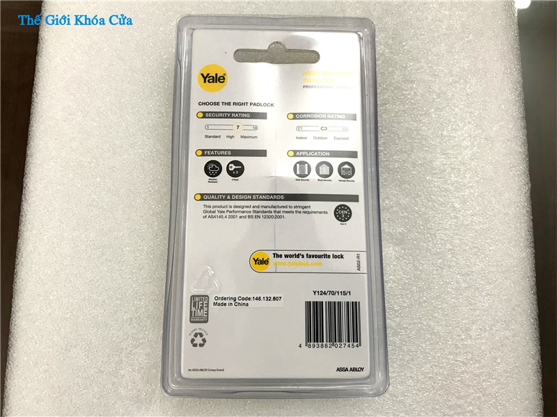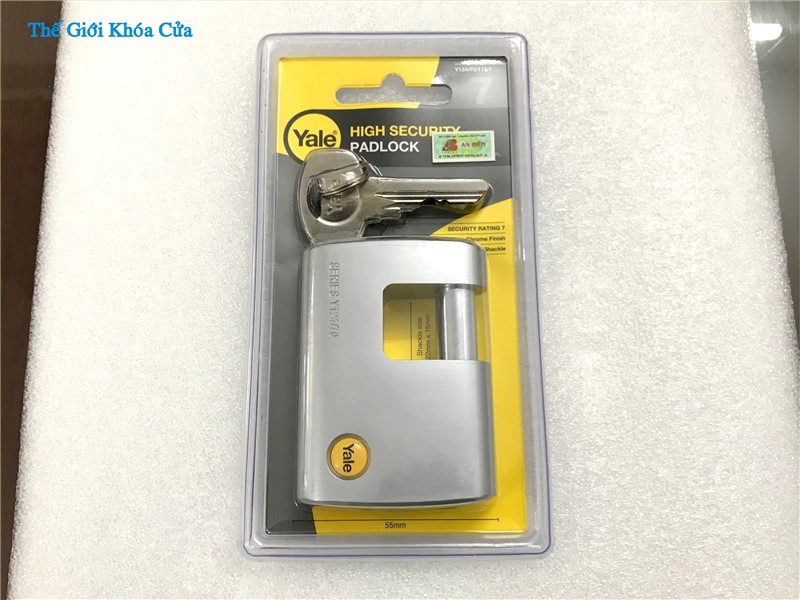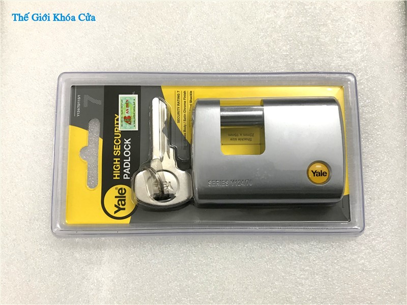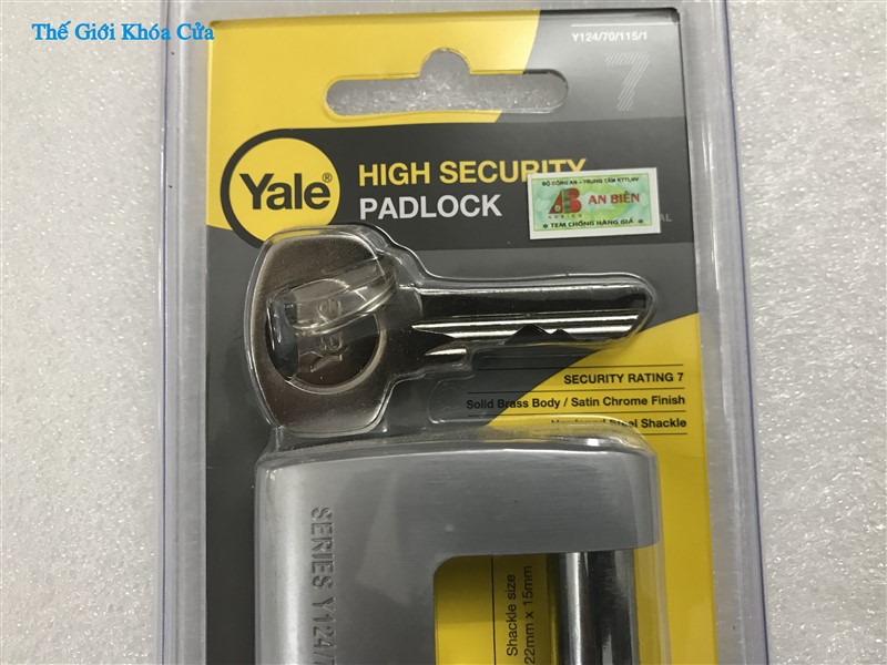 Khóa cầu ngang chống cắt, chống trộm cao cấp Yale - Y124/70/115/1 của thương hiệu danh tiếng toàn cầu Yale có thân được làm bằng đồng mạ Niken phủ trắng bên ngoài. Khóa có côn ( vòng cầu ) làm bằng thép tôi Boron có độ cứng cao chống cắt. Khóa phù hợp cho sử dụng ngoài trời vì chịu nắng mưa rất tốt.