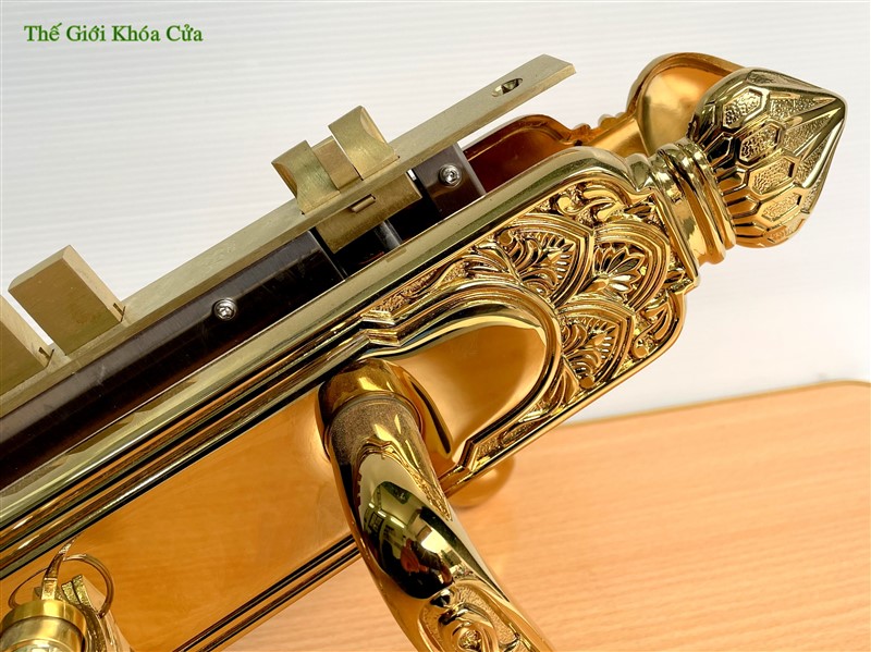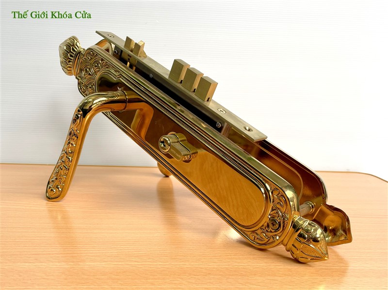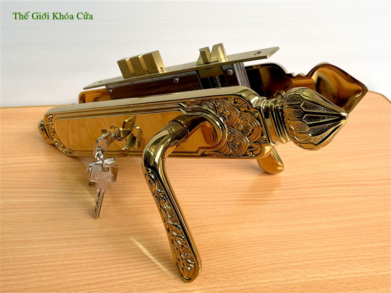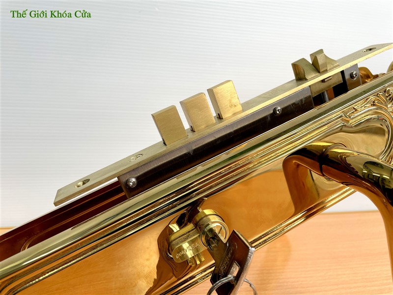 Khóa cửa thương hiệu Gold SSA, được làm bằng đồng đỏ 57% sau đó được mạ vàng bằng công nghệ mạ PVD ( công nghệ mạ bằng phương pháp bay hơi bám trụ bề mặt ở nhiệt độ cao ) tạo nên cho sản phẩm bề mặt sáng bóng, đường nét tinh xảo và không bị ô xi hóa theo thời gian