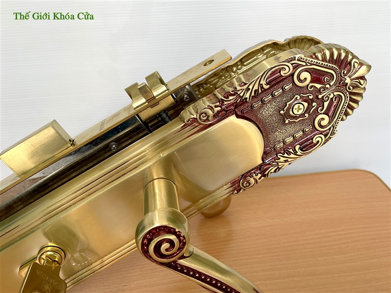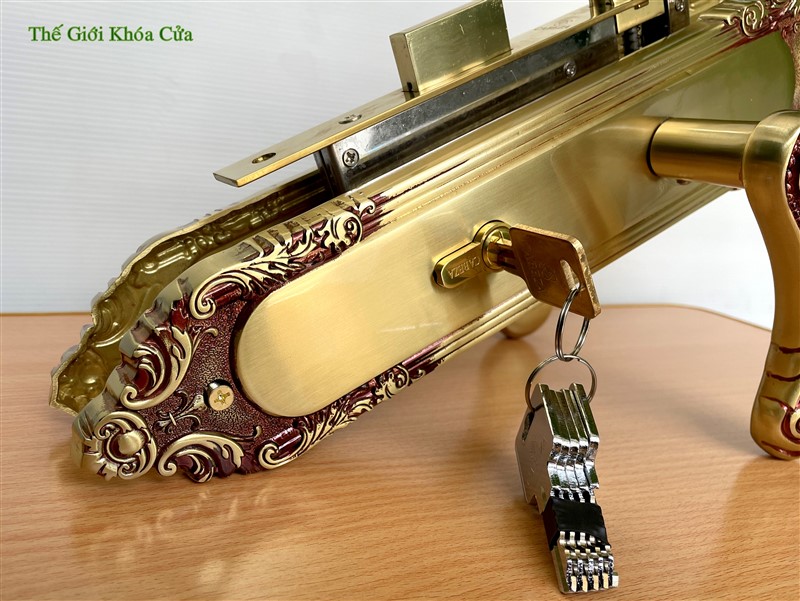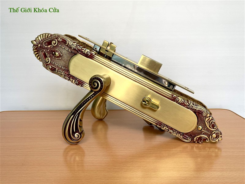 Khóa được làm bằng đồng thau, hoa văn khóa dạng cổ điển cầu kì, tay khóa dạng uốn lượn cong. khóa thường được lắp cho nhà có kiến trúc hoa văn cầu kì.