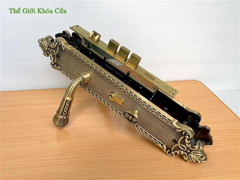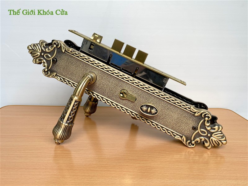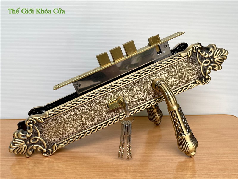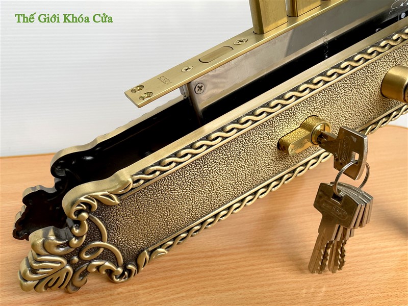 Khóa được làm bằng đồng nguyên khối chất lượng cao, bề mặt được tạo màu rêu đồng thời phủ một lớp 2k chống hoen gỉ, chống ô xi hóa. Khóa có dạng hoa văn tân cổ điển. đường nét tinh xảo, không vết lỗi.