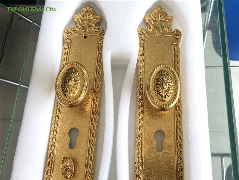 Khóa có hoa văn cầu kì tinh xảo dạng tân cổ điển, từng đường nét được trau chuốt tỉ mĩ không vết lỗi. Khóa xứng đáng là bộ khóa cửa đại sảnh đẳng cấp.