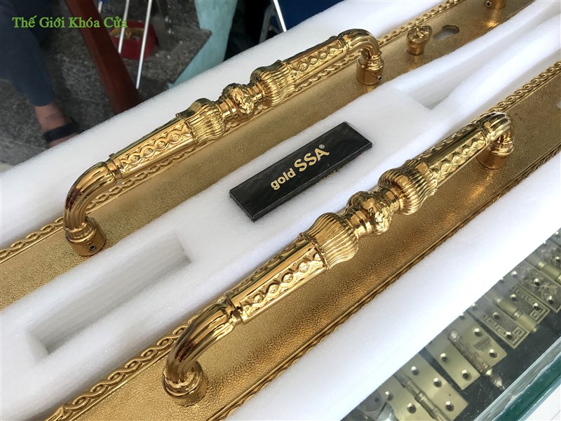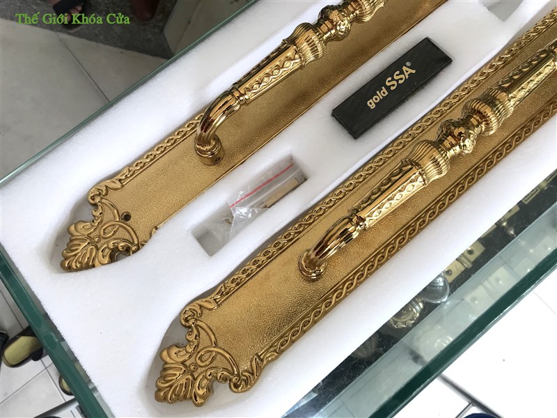 Khóa cửa đại sảnh Gold SSA XXL-6868-PVD được nhập khẩu nguyên chiếc bởi Gold SSA Thái Lan. Khóa có kích thước rất lớn ( dài 81cm ) thường được lắp cho cửa đại sảnh, cửa đại hội có kích thước lớn, hoa văn cầu kì.