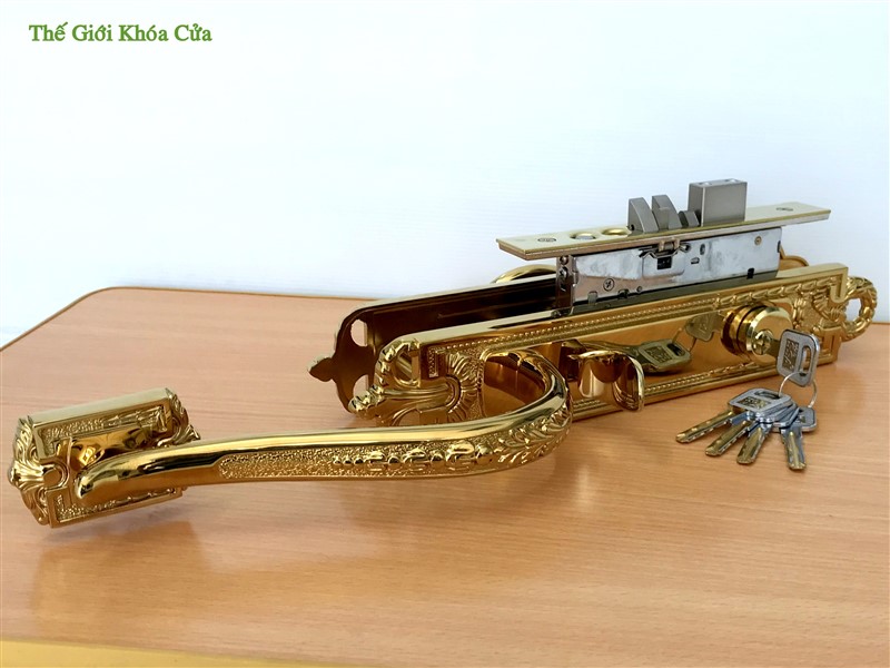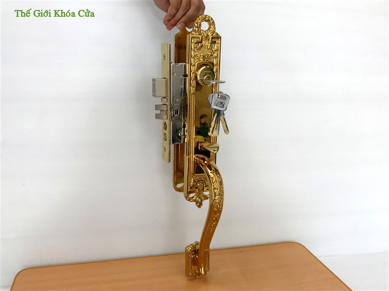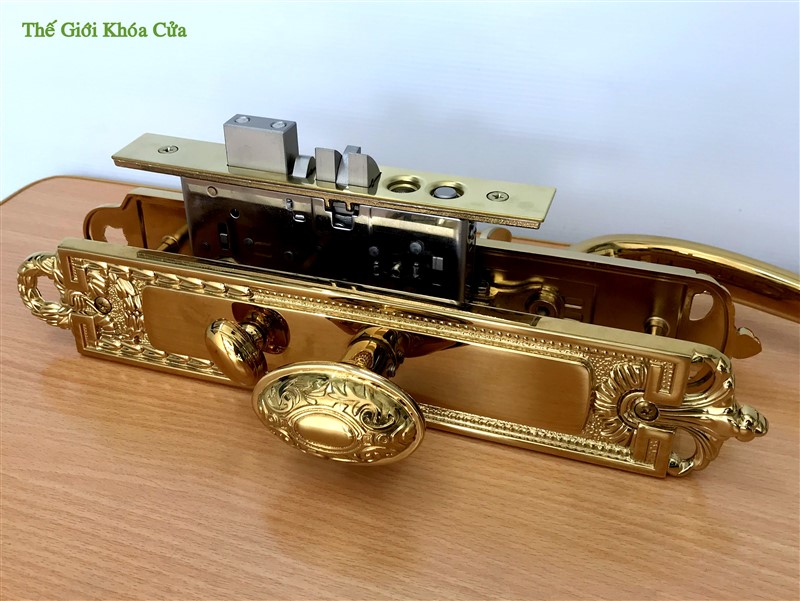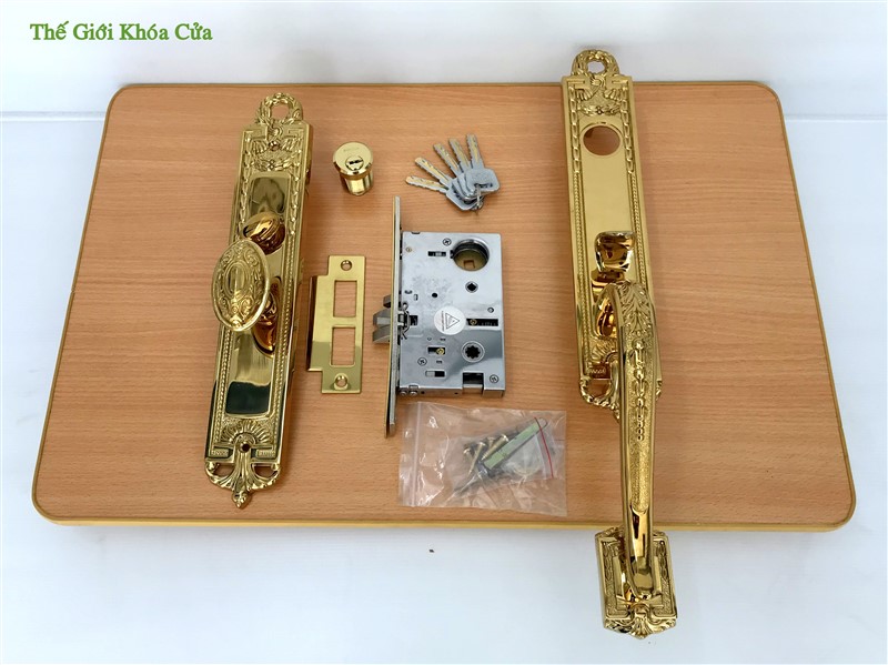 Khóa được làm bằng đồng có thiết kế hoa văn kinh điển của mẫu khóa lắp cho cửa đại sảnh