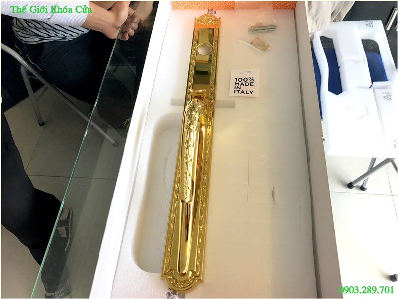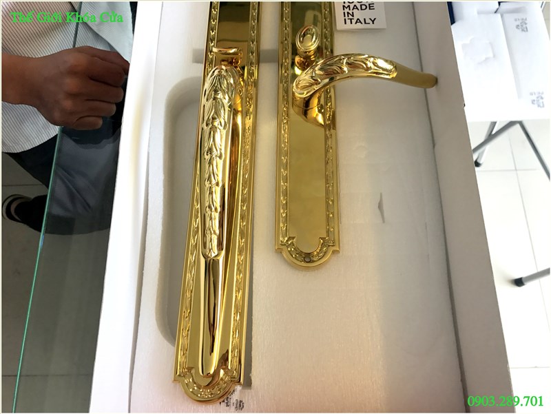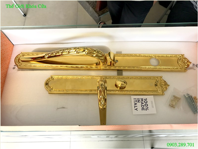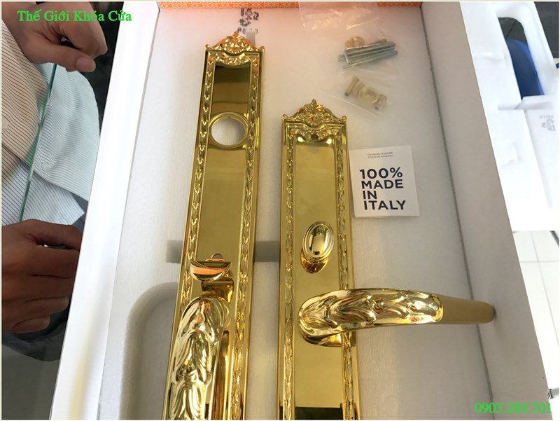 Khóa cửa nhập khẩu Italy Enrico Cassina dòng Collection - dùng cho cửa đại sảnh được làm hoàn toàn từ những thanh đồng cao cấp bằng phương pháp dập nóng tạo hoa văn hoàn toàn thủ công. Bề mặt của khóa được mạ vàng 24k trong 2000 giờ mạ bởi hãng mạ danh tiếng Ompico.