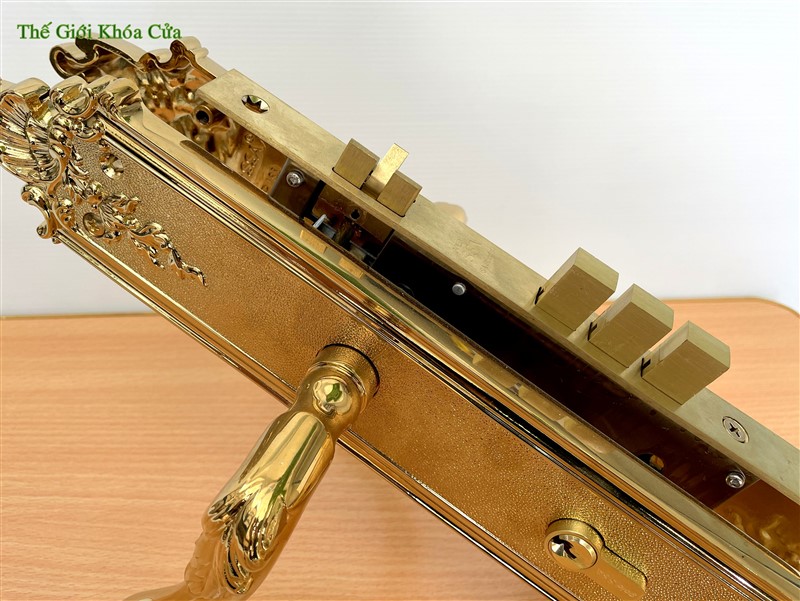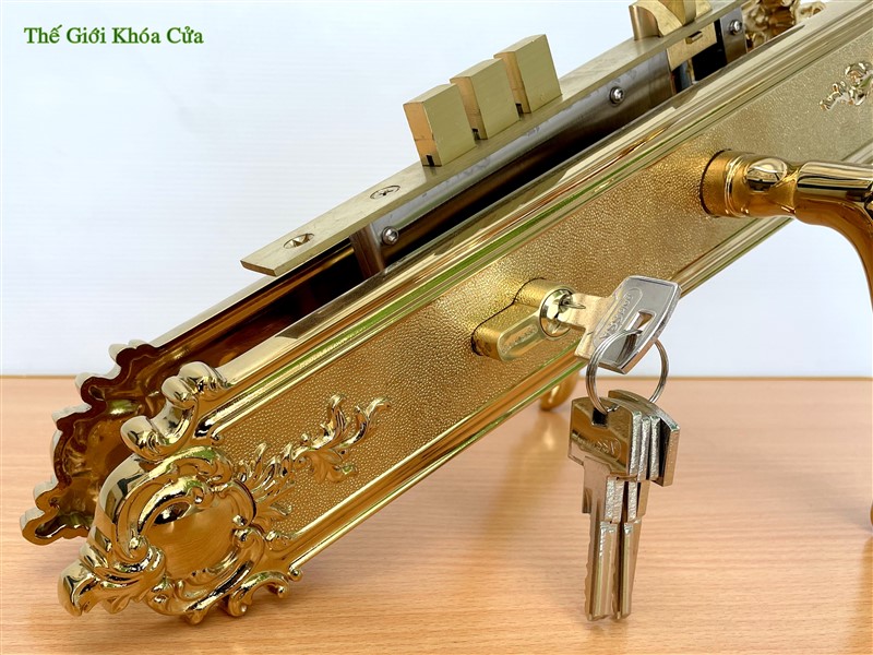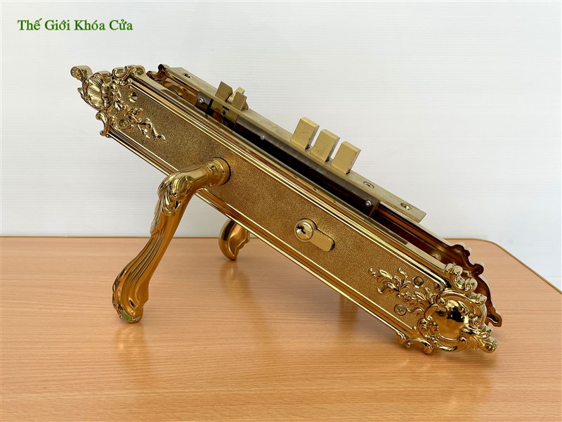 Khóa cửa thương hiệu Gold SSA, được làm bằng đồng đỏ 57% sau đó được mạ vàng bằng công nghệ mạ PVD ( công nghệ mạ bằng phương pháp bay hơi bám trụ bề mặt ở nhiệt độ cao ) tạo nên cho sản phẩm bề mặt sáng bóng, đường nét tinh xảo và không bị ô xi hóa theo thời gian