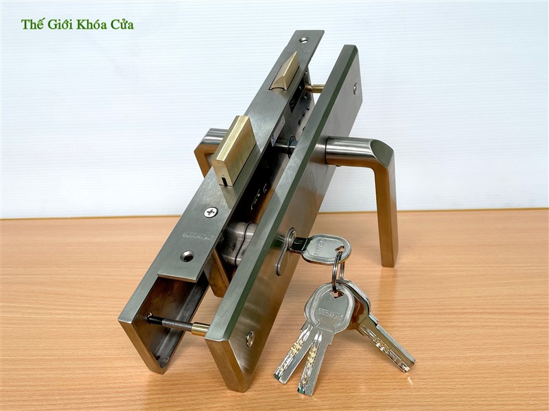 Khóa có ốp khóa dạng hình chũ nhật, bề mặt xước mờ, tay khóa dạng thẳng dẹt tao cho khóa có hình dáng hiện đại,