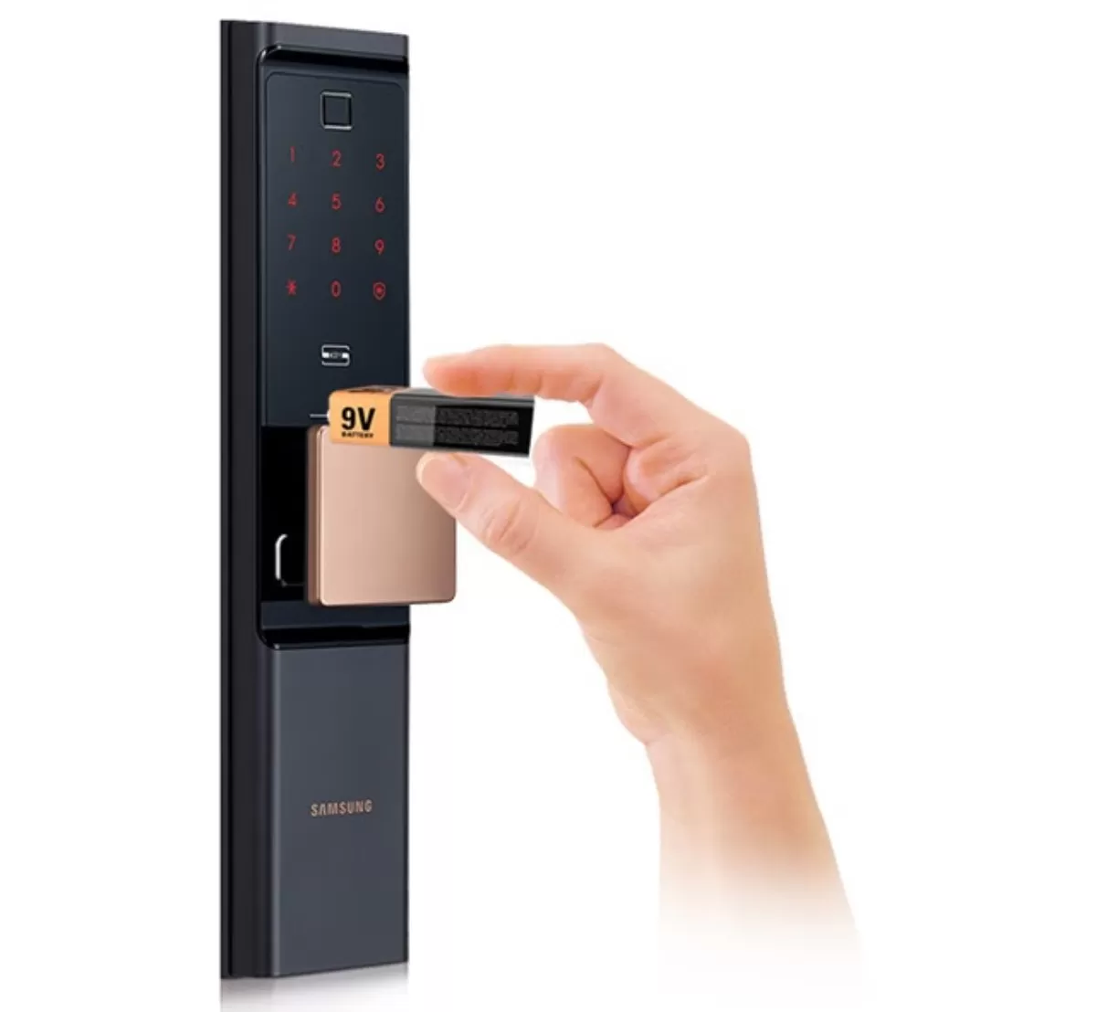 Nhiều loại khóa vân tay được thiết kế với cổng cấp nguồn khẩn cấp bên ngoài. Bạn chỉ cần chuẩn bị một viên pin vuông 9V và chạm vào hai cực nguồn trên thân khóa. Khi khóa được cấp điện tạm thời, bạn có thể mở cửa bằng vân tay hoặc mã số như bình thường.