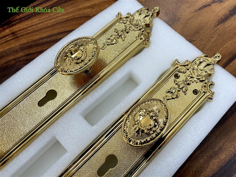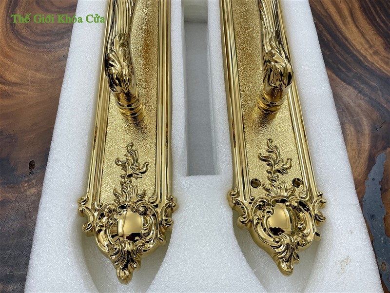 Khóa có hoa văn cầu kì tinh xảo dạng tân cổ điển, từng đường nét được trau chuốt tỉ mĩ không vết lỗi. Khóa xứng đáng là bộ khóa cửa đại sảnh đẳng cấp.
