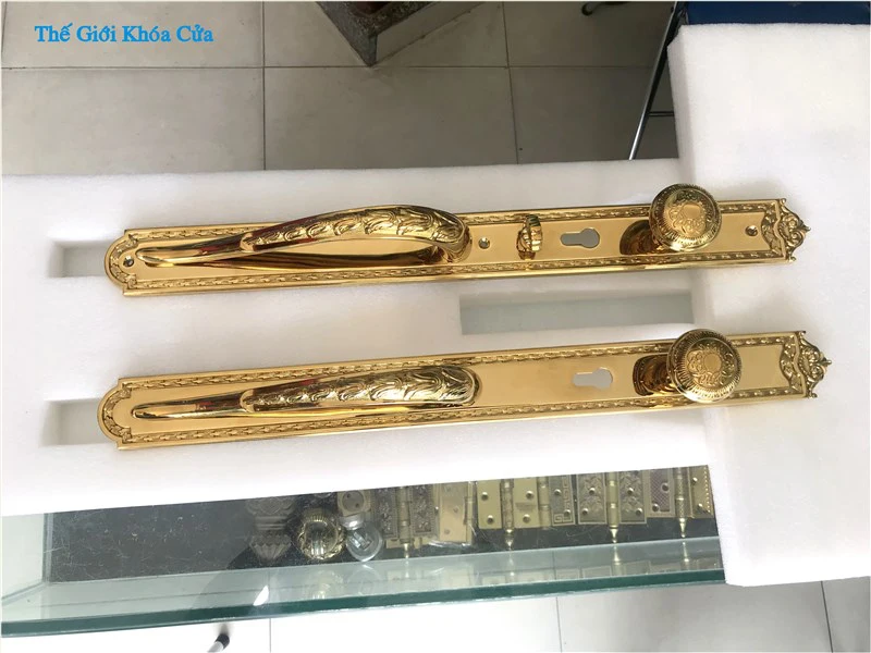 Dành cho các nhà phố có cửa đại sảnh lớn hoặc cửa đại hội, XXL-6363-PVD là mẫu khóa có kích thước ấn tượng với ốp dài 810 mm, rộng 68 mm. Toàn bộ khóa được chế tác từ đồng cao cấp mạ vàng PVD, với độ cứng bề mặt 6,5 Moh, tương đương độ cứng của kính tôi, giúp chống trầy xước hiệu quả.