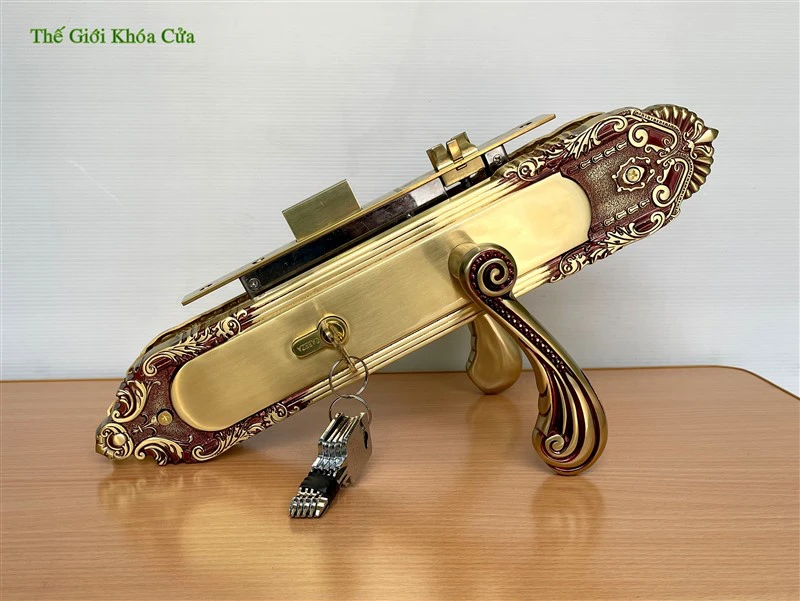 Thiết kế của thương hiệu này thiên về sự bề thế, chắc chắn và nổi bật. Khi lắp đặt trên cửa gỗ lớn, tổng thể tạo cảm giác uy nghi và sang trọng.