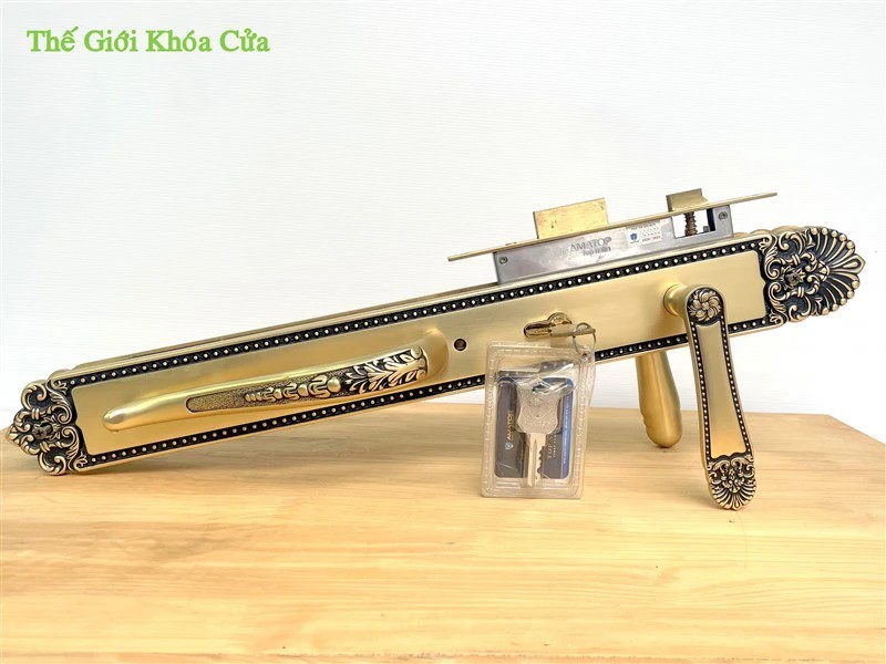 Một mẫu khác có thiết kế tương đồng nhưng thiên về sự tinh giản hơn là khóa đại sảnh bằng đồng cao cấp AMATOP XXL-8811-SF-D. Dòng khóa này vẫn giữ kích thước lớn, tay gạt thẳng tròn tạo cảm giác chắc chắn, phù hợp với những công trình Indochine đề cao sự cân đối và tiết chế họa tiết. Màu sắc, chất liệu và cấu hình kỹ thuật của khóa đảm bảo đồng bộ với các phụ kiện cửa cao cấp khác, giúp bộ cửa hoàn thiện cả về công năng lẫn thẩm mỹ.